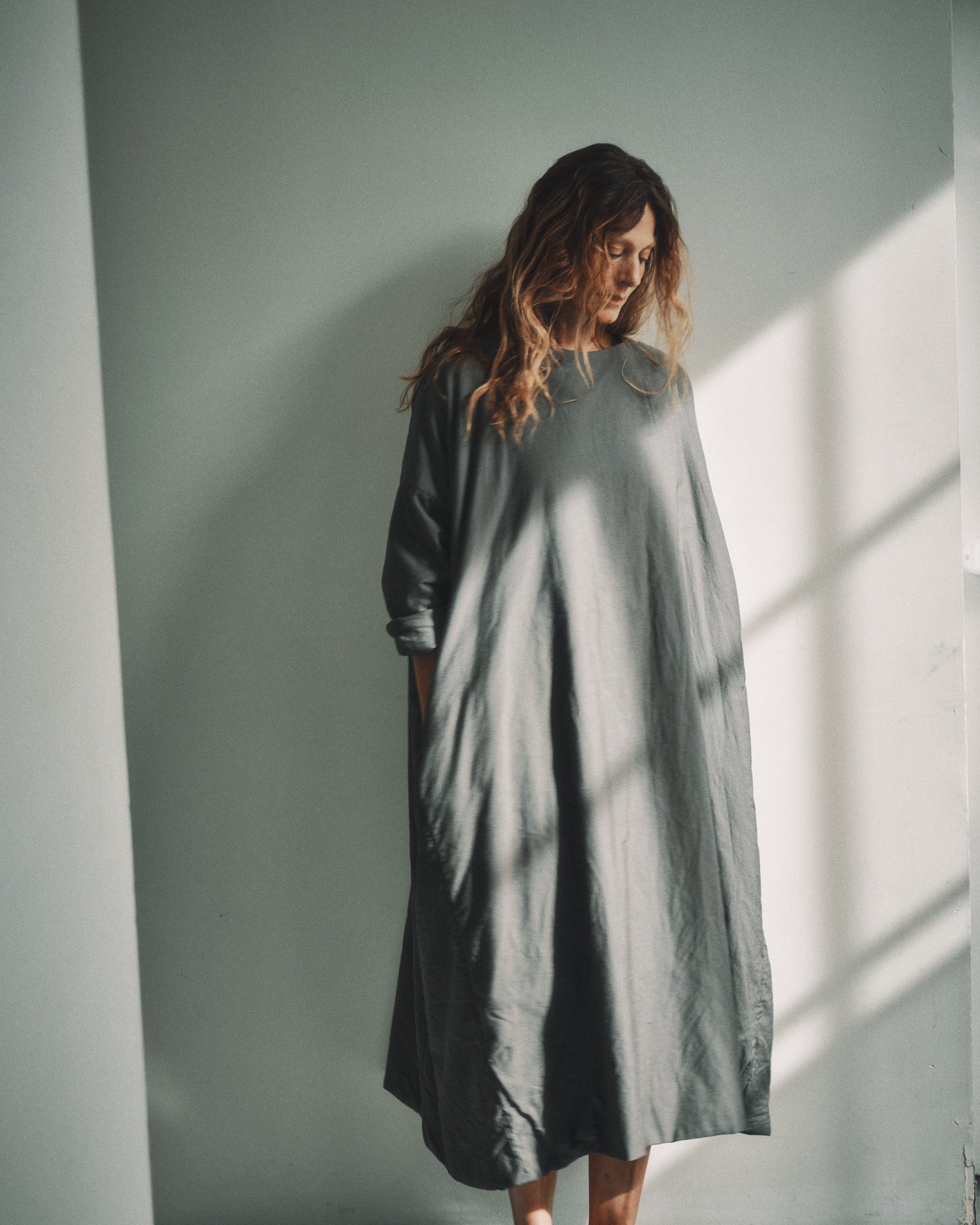 Everything in Giorgia's collections is handknitted or hand sewn, and produced in very small batches with a dedication to sustainability with zero waste production. All excess and cast-off is reused in clothes, accessories, or packaging. A Nitto sweater can require up to 50 hours of work, and the handwritten tag includes the name of the person who made the garment.