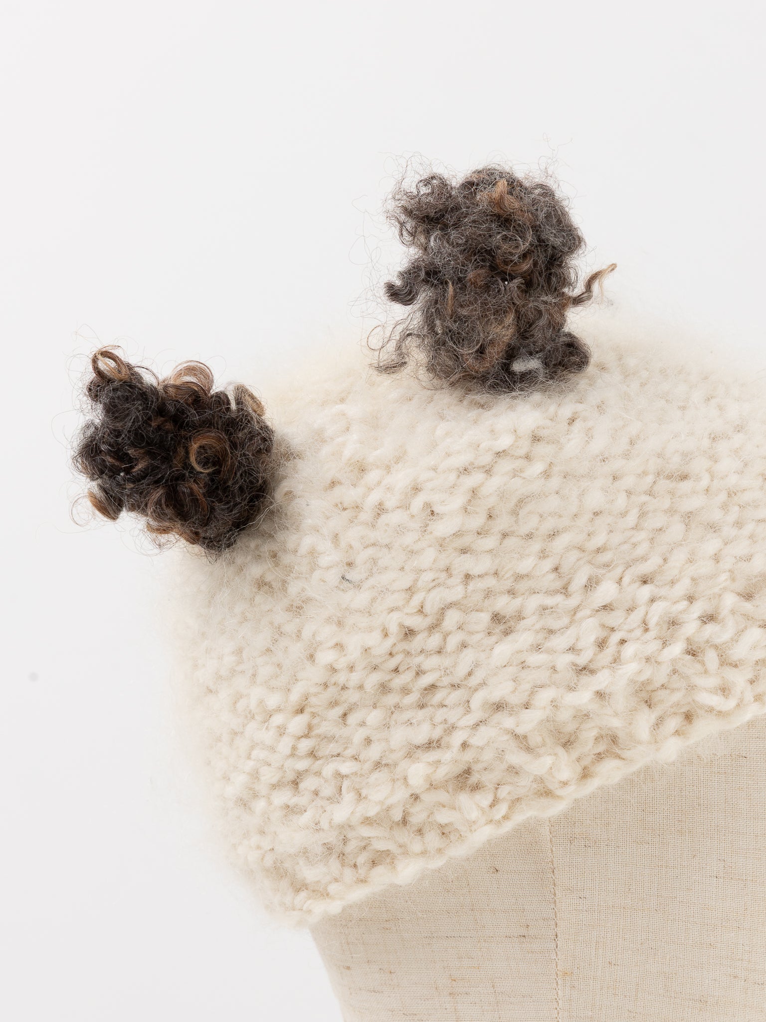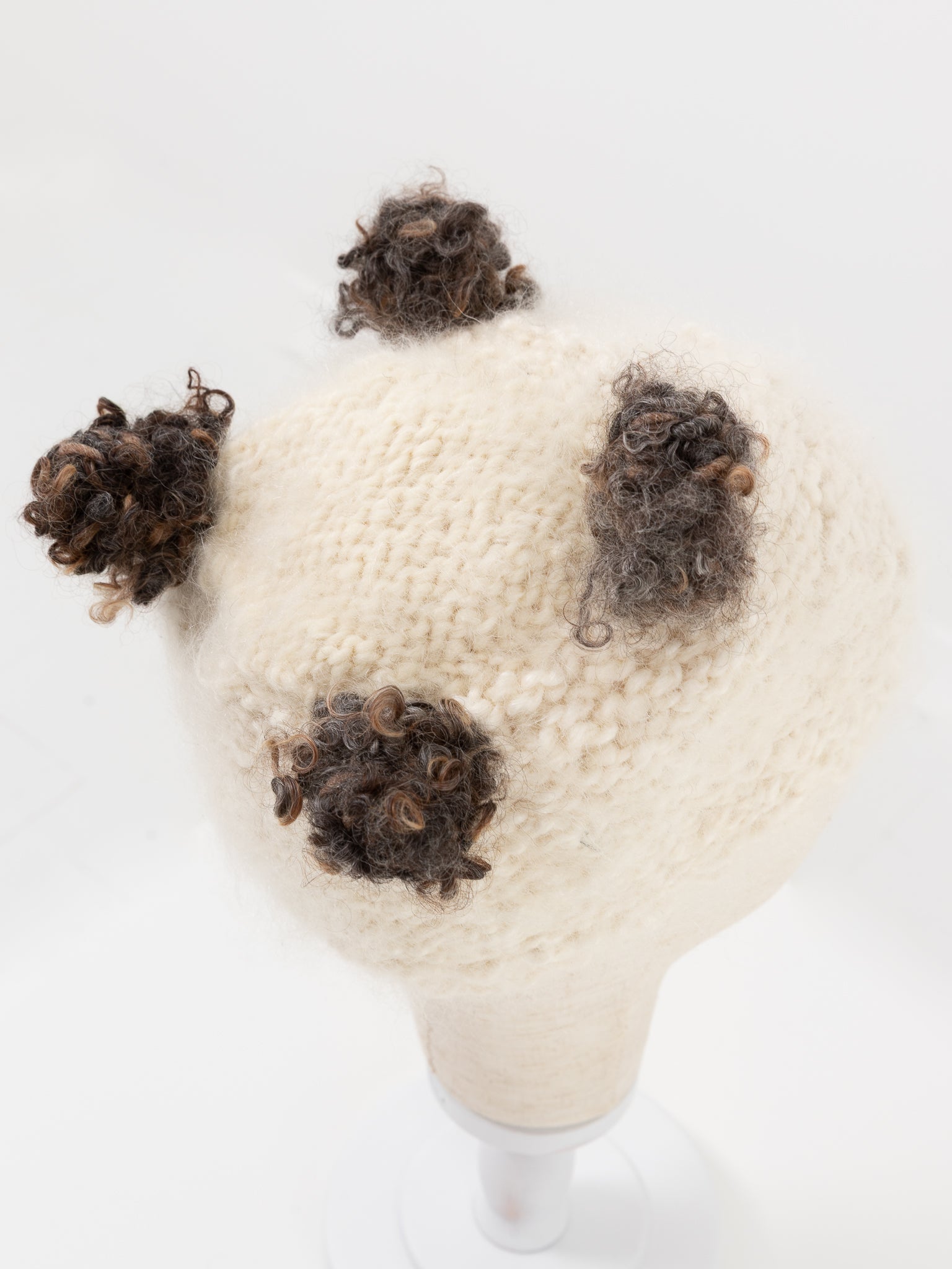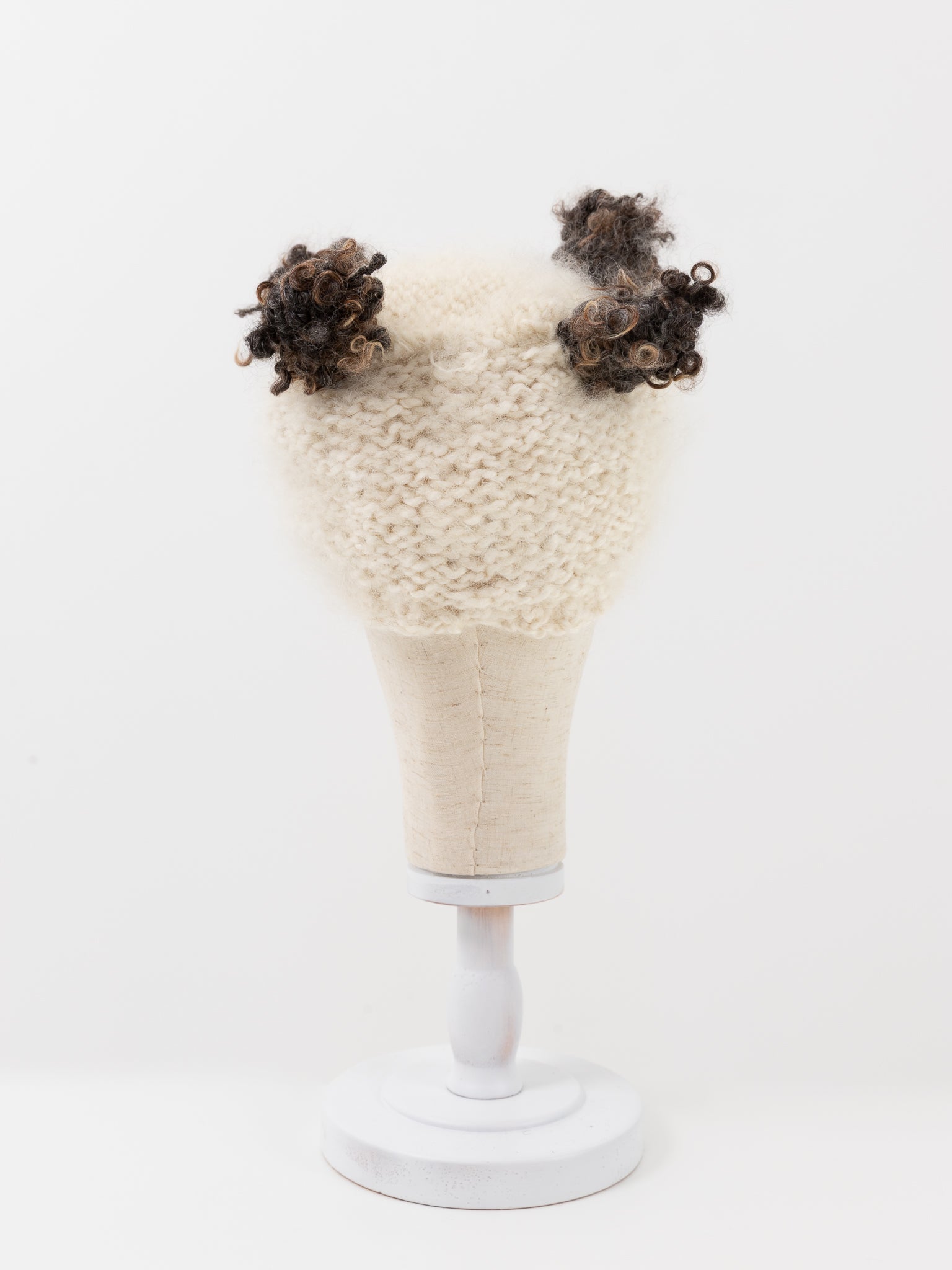The Corner Hat is knitted from mixed banana yarn and mohair wool with hand shaped corners that tilt slightly with movement. Soft and warm.