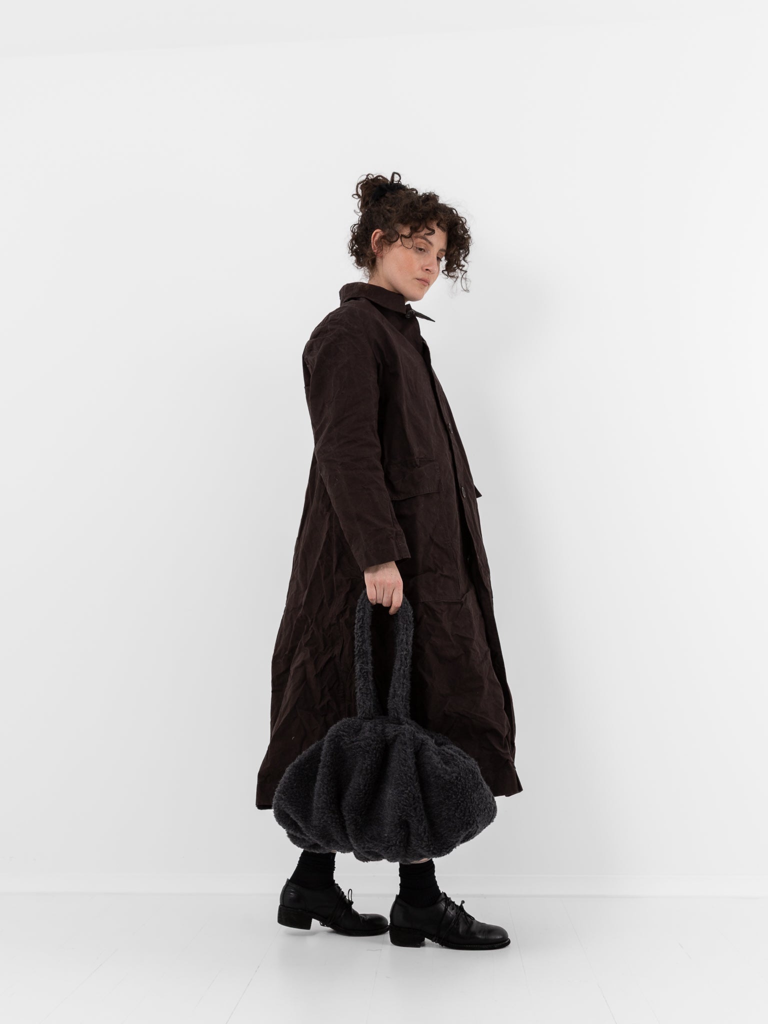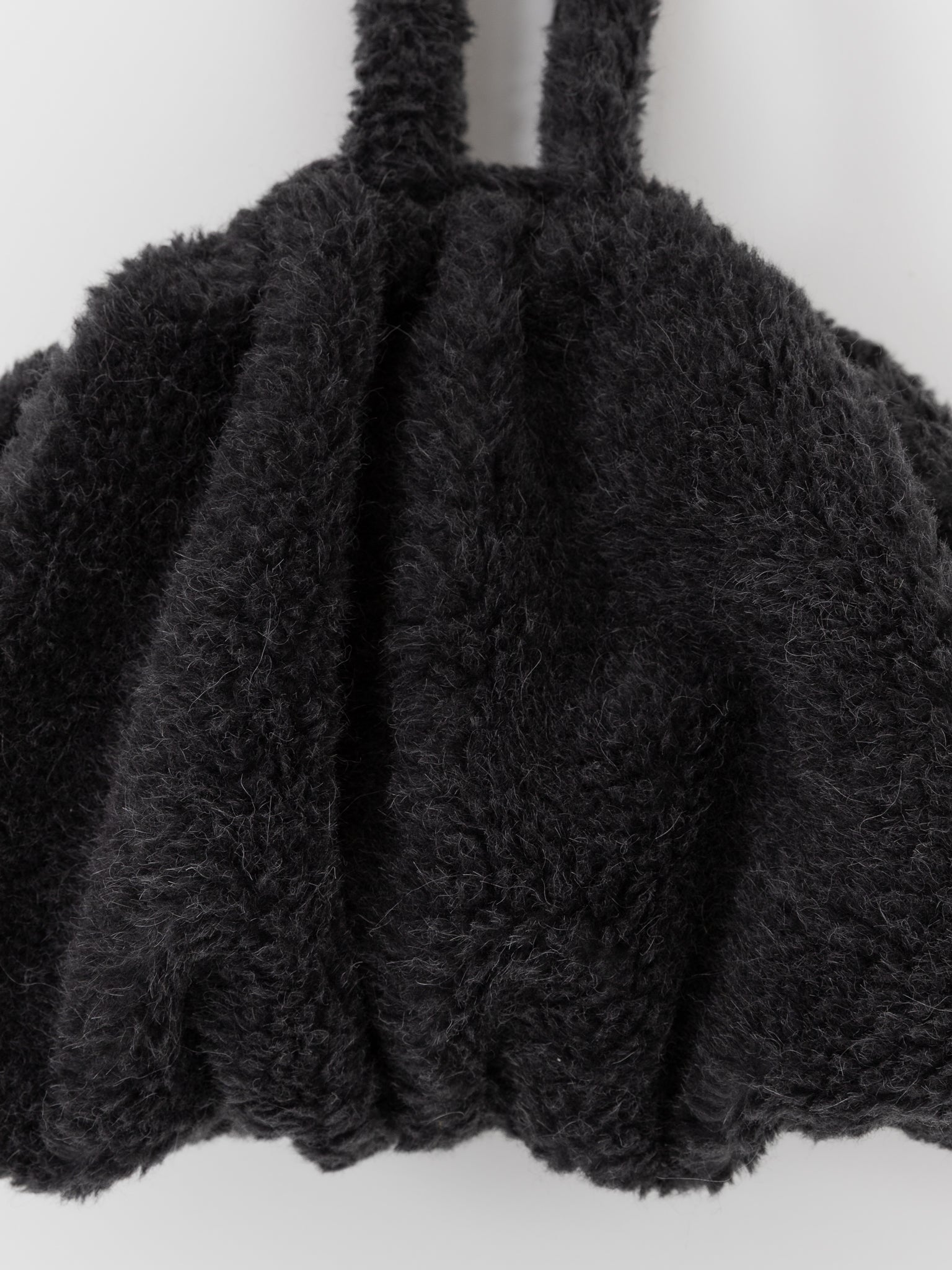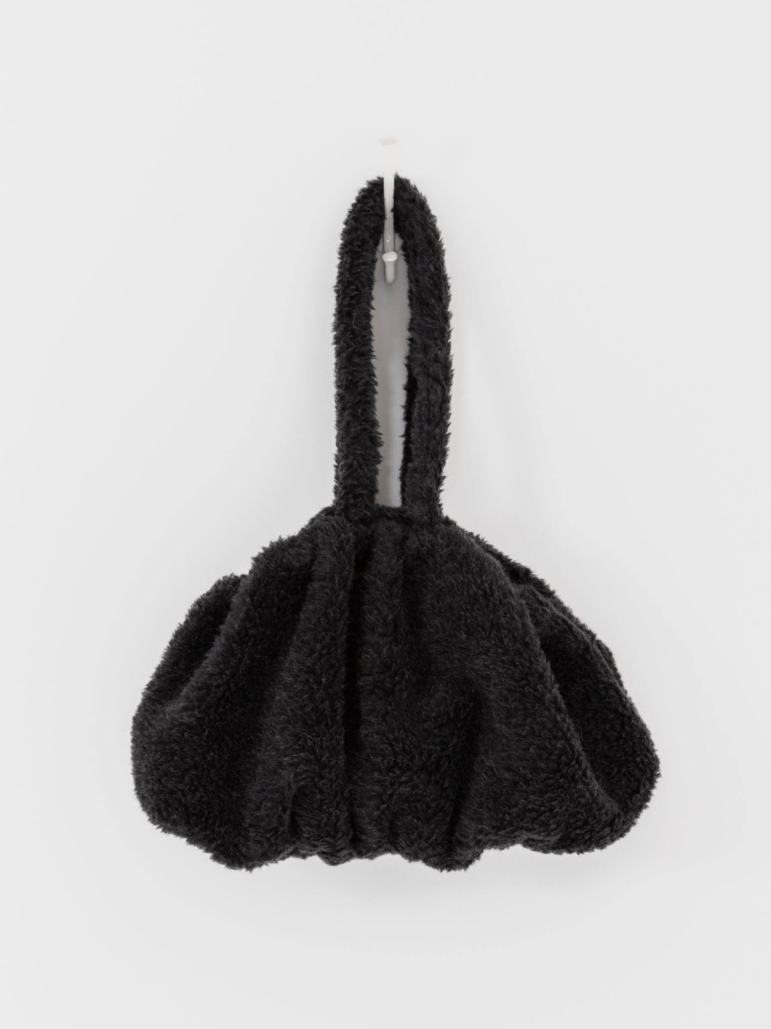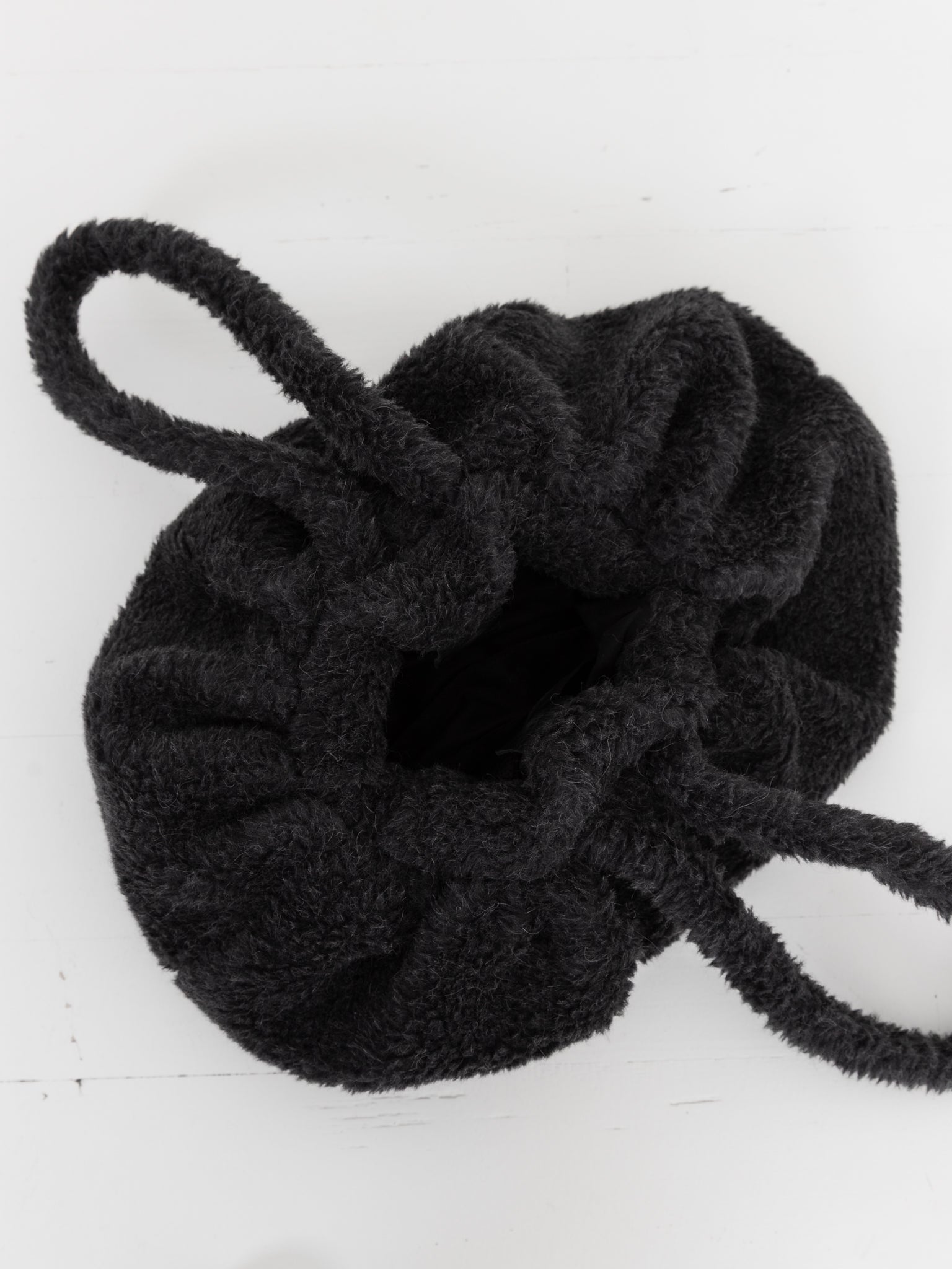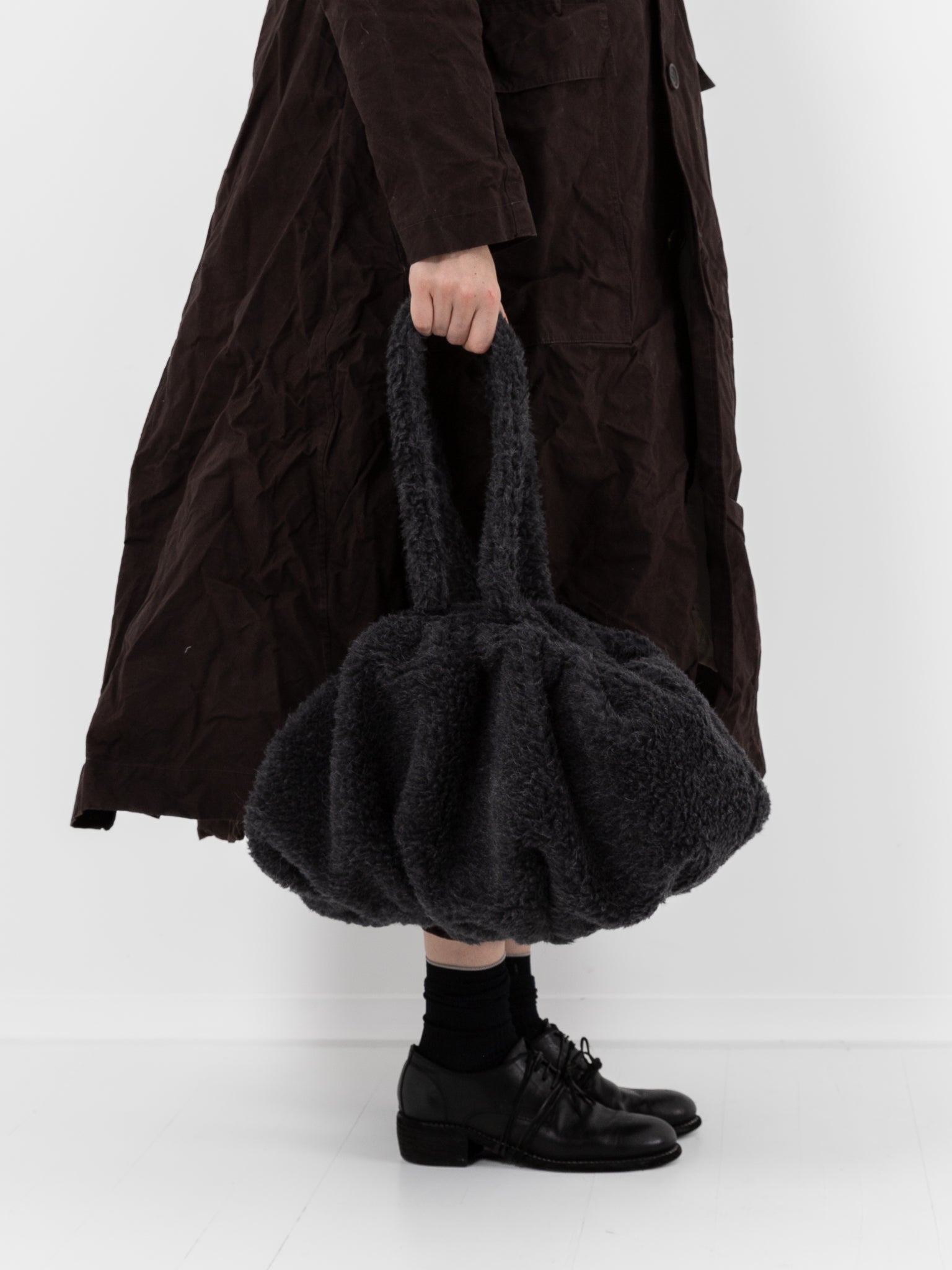 A plush fuzzy tote made from a thick and textured alpaca that resembles shearling. This bag features two rounded fuzzy handles, making it super comfortable to wear, and a snap closure. The puffy body creates a cozy, earthy, and cloud-like feeling. Warm, winter-friendly aesthetic. Fully lined in cotton twill with an interior zip pocket and a patch pocket as well.