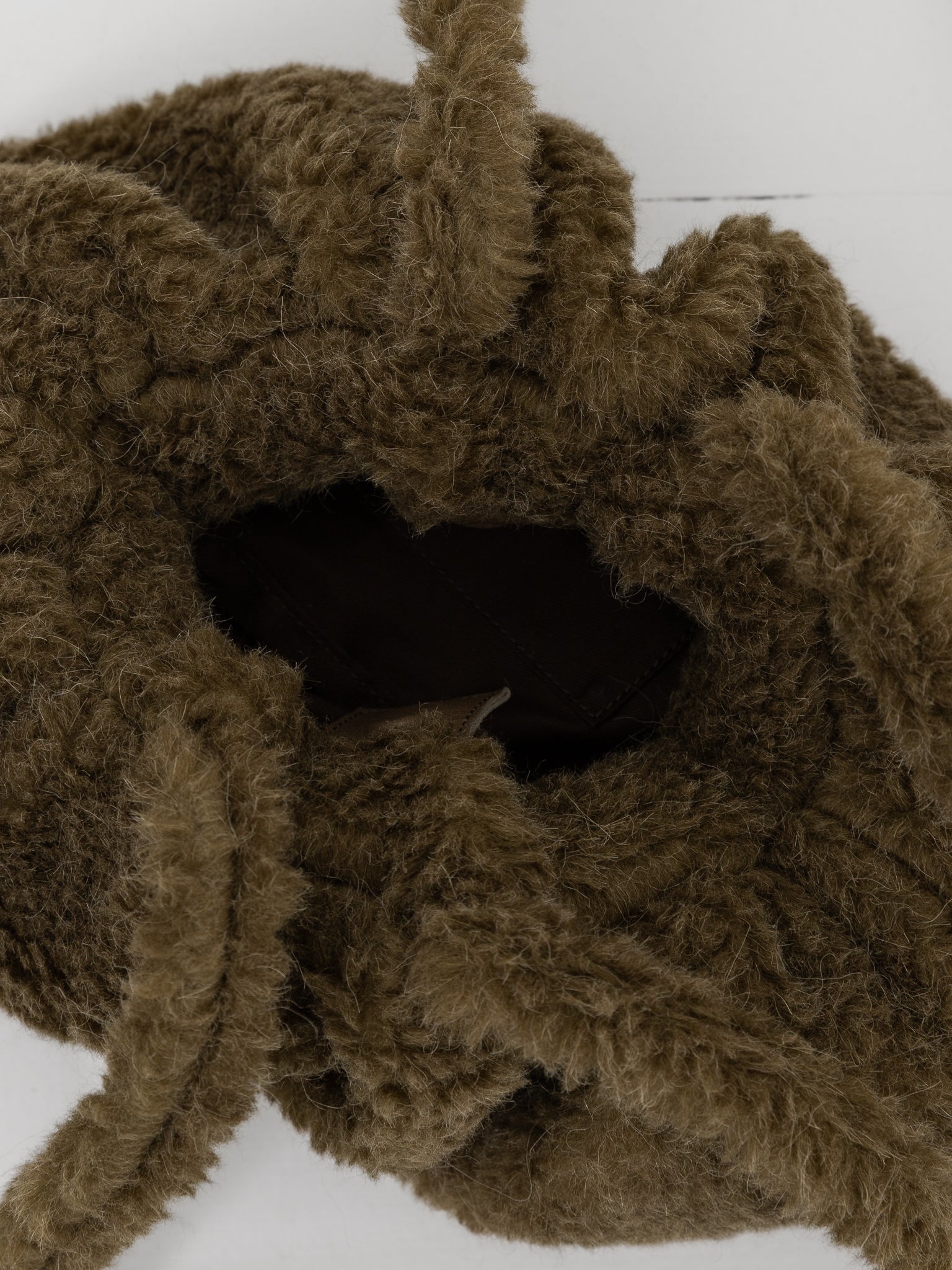 A plush fuzzy tote made from a thick and textured alpaca that resembles shearling. This smaller version of the TR036 bag features two rounded fuzzy handles, making it super comfortable to wear, and a snap closure. The puffy body creates a cozy, earthy, and cloud-like feeling. Warm, winter-friendly aesthetic. Fully lined in cotton twill with an interior zip pocket and a patch pocket as well.