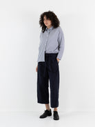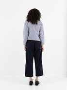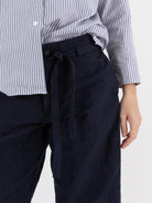 Bergfabel Cloe Pants in Navy. Cropped trouser with a belted tie waist and concealed button fly in a structured cotton. This trouser has side slit pockets and two back patch pockets.