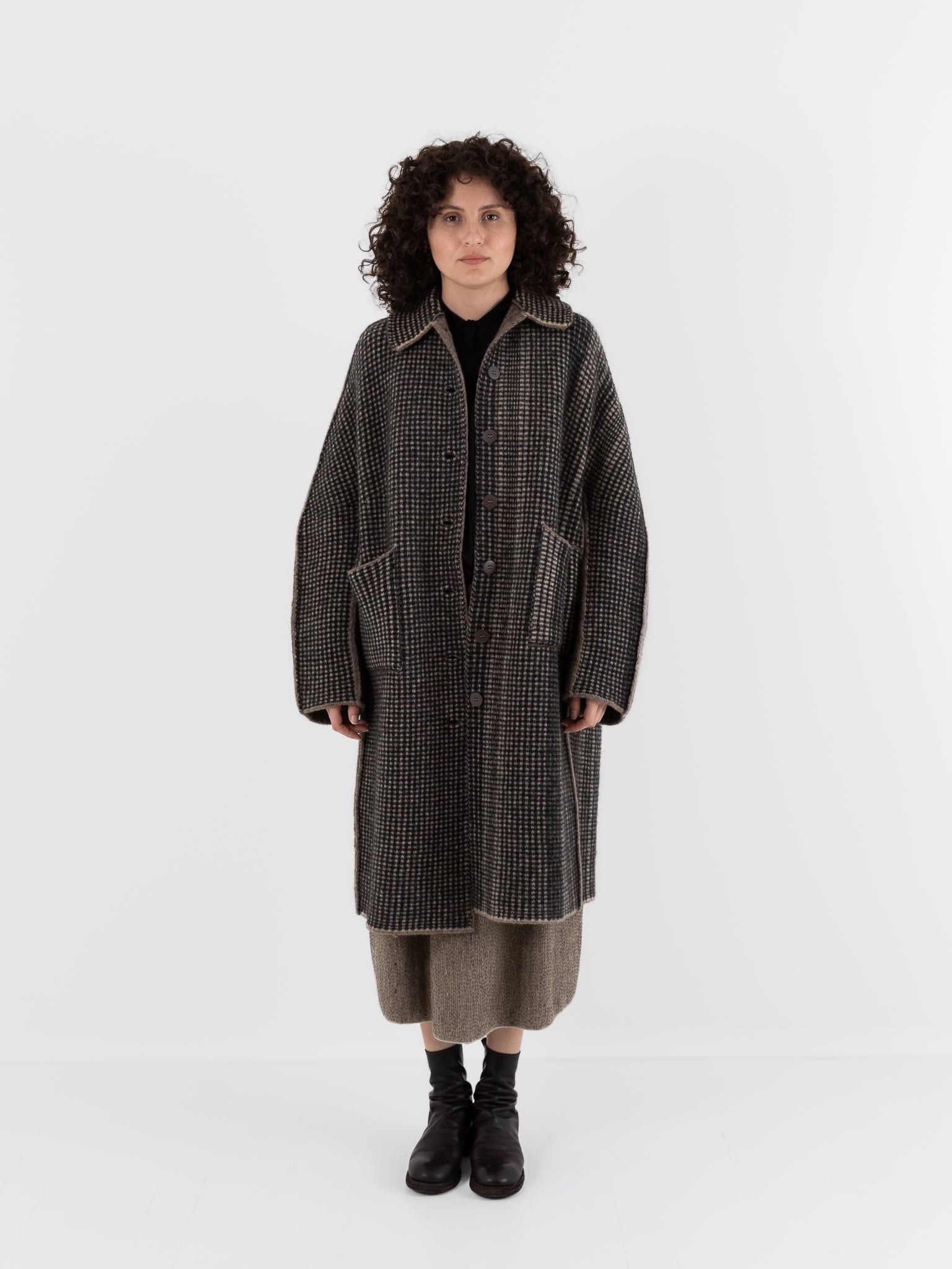 A classic Boboutic coat that is fully reversible. One side features a check pattern, large patch pockets, and visible buttons. The reverse side is a mottled taupe with side pockets and concealed buttons. Large rounded collar with a removable neck piece for additional warmth when needed.