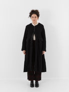 The Jerkin Coat from John Alexander Skelton is a long collarless coat in a heavyweight black wool finished with large buttons. This coat is fully lined in a self stripe cream cotton and has two interior chest welt pockets, as well as two front pockets with flaps and a chest welt pocket.