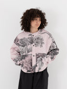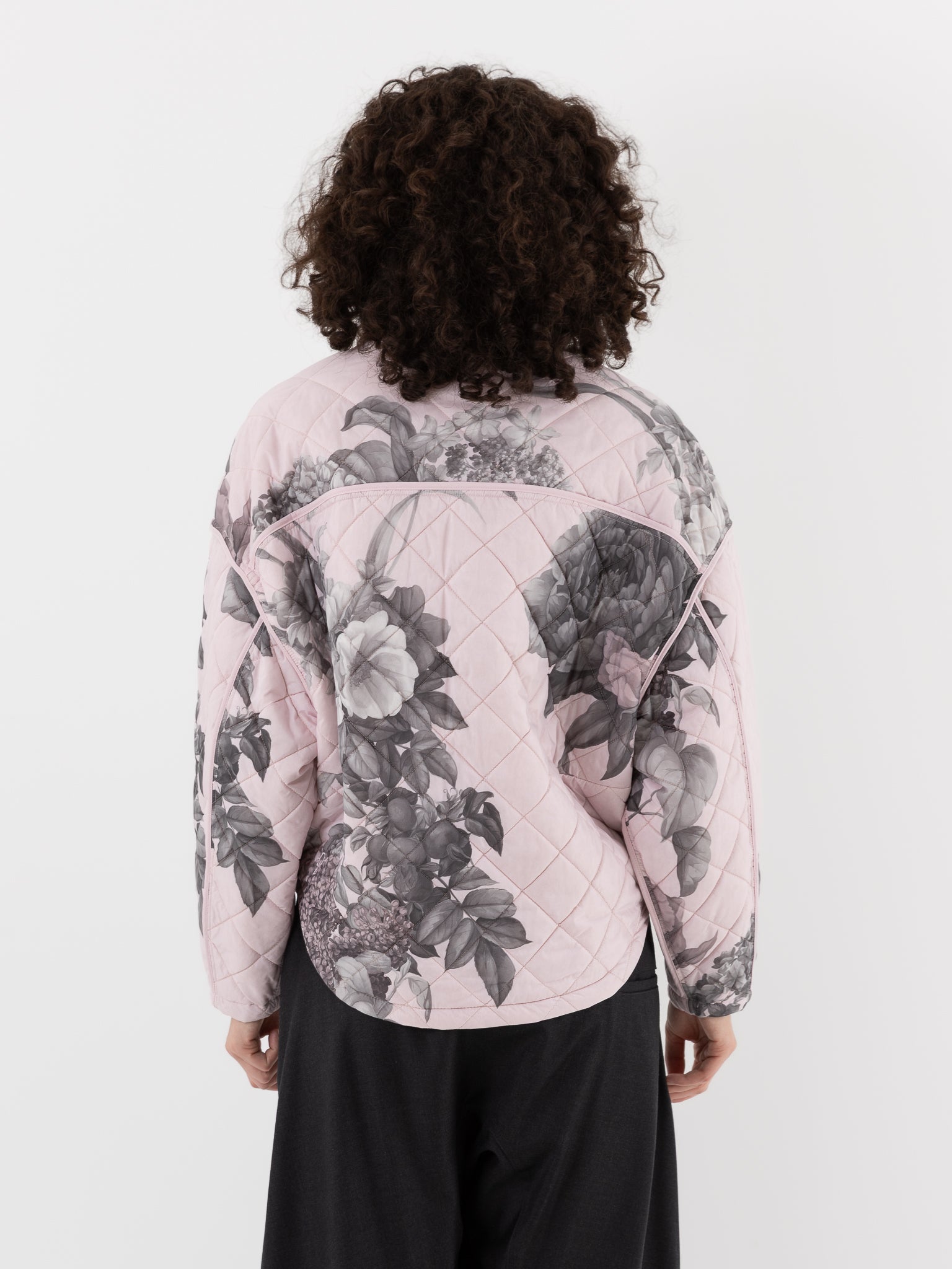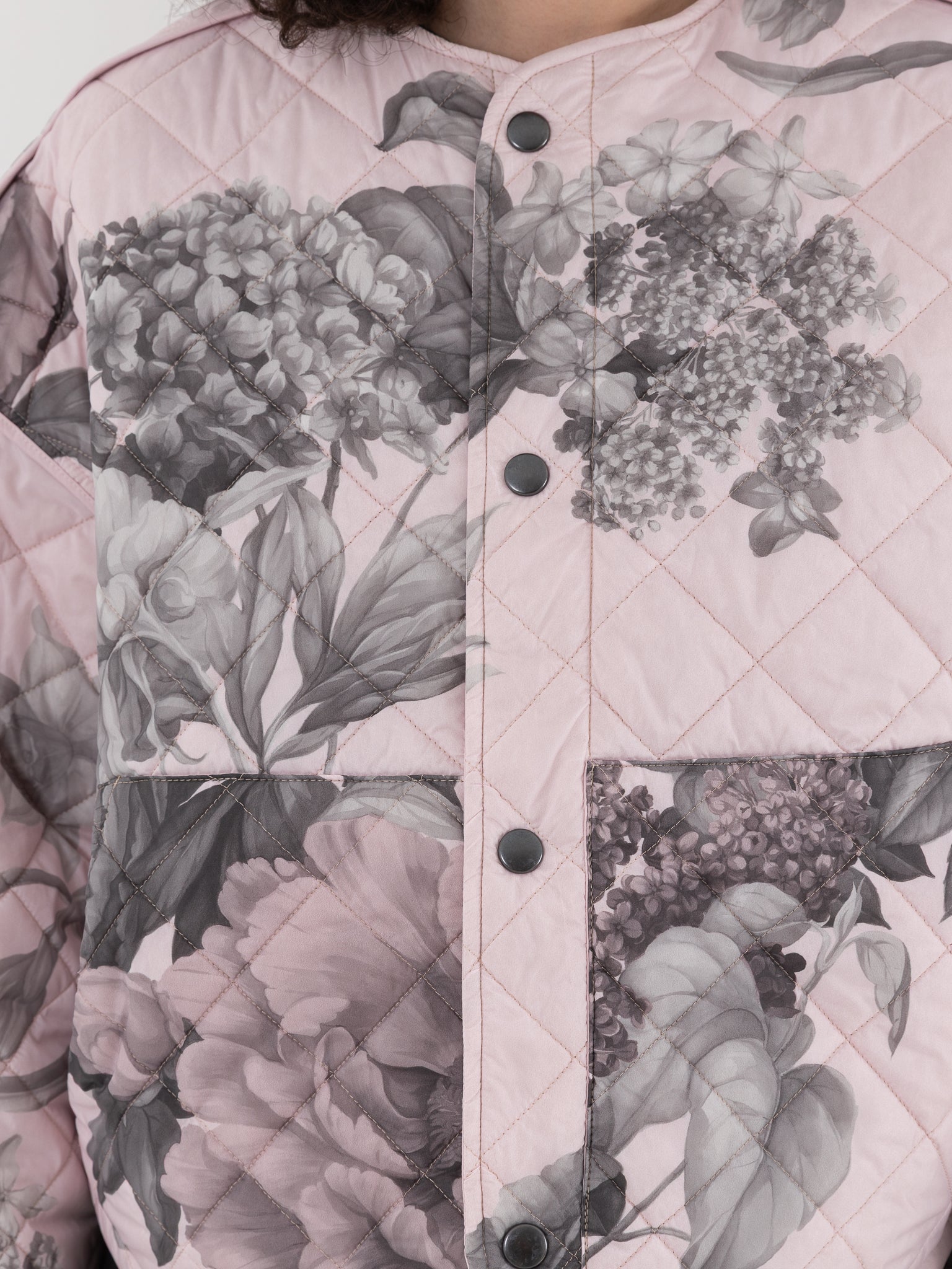 Reversible collarless cropped jacket made from an organic cotton with recycled polyamide. One side is a diamond quilted grey floral print on pink with patch pockets, while the reverse is a smooth and solid blush pink organic cotton with welt pockets.