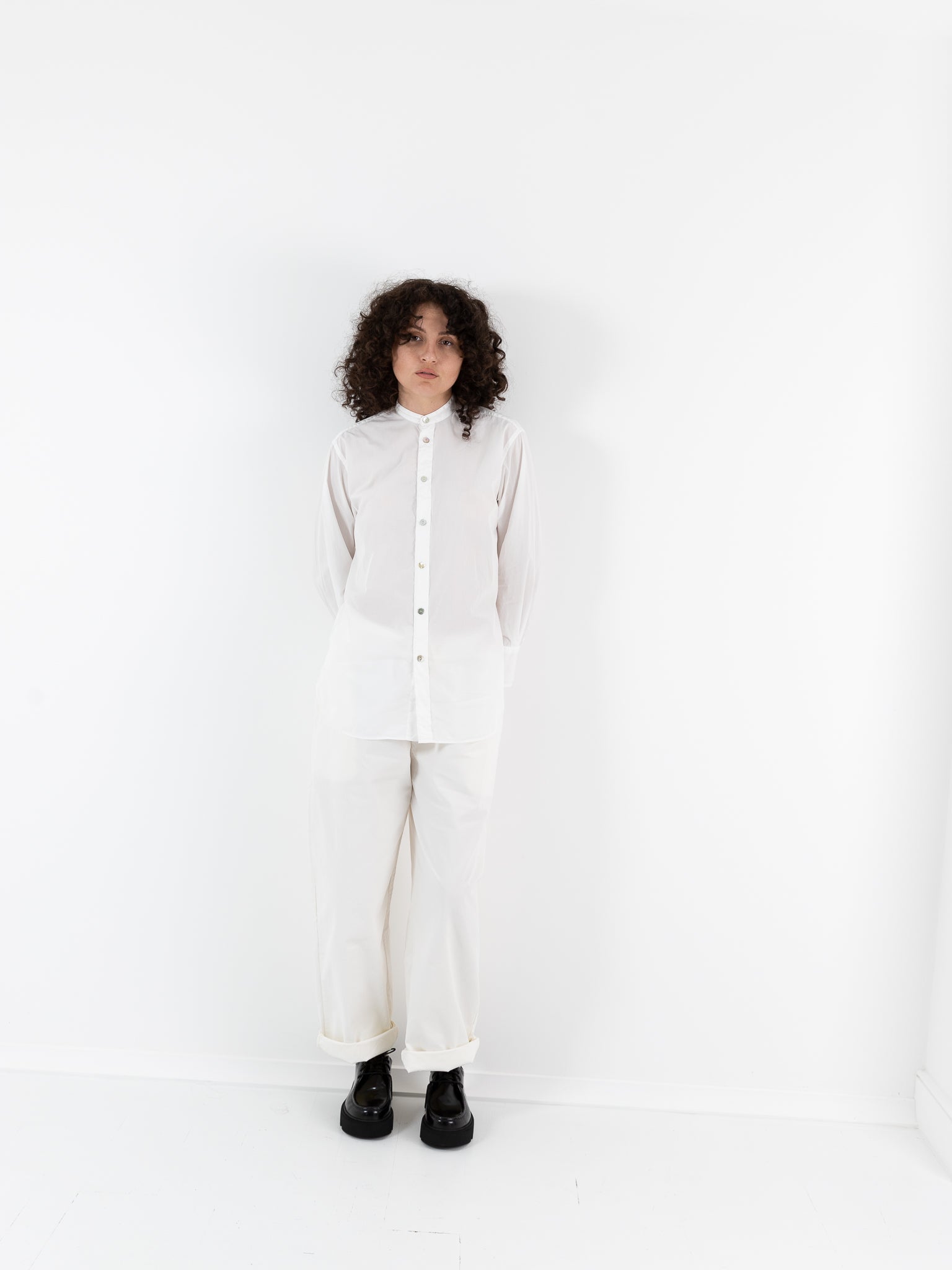 Nitto Rosie Shirt in Off White. A relaxed fitting long sleeve shirt with a stand collar in a lightweight Italian cotton poplin. This button down shirt has a gathered back yoke for fullness and buttoned cuffs. Finished with Nitto's signature crocheted square on the center back.