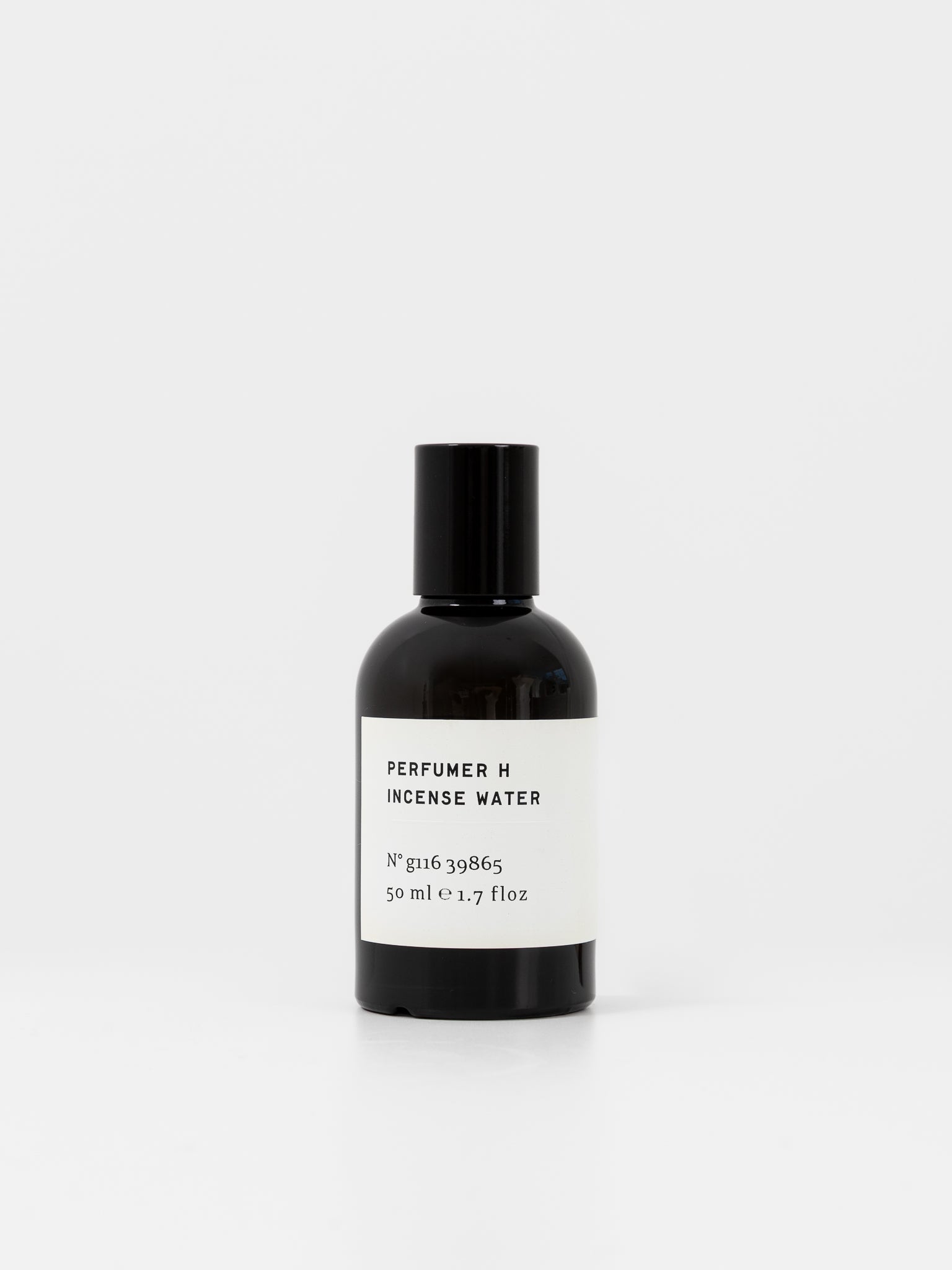 Perfumer H Incense Water 50ml Perfume. A holy water of herbs, resins, incense smoke and amber. Top notes of bergamot and lavender fuse with roman chamomile, geranium (Egypt) and saffron to gently rest on a base of frankincense (Somalia) and the soft woods of sandalwood, cedar wood and amber. Made in the UK.
