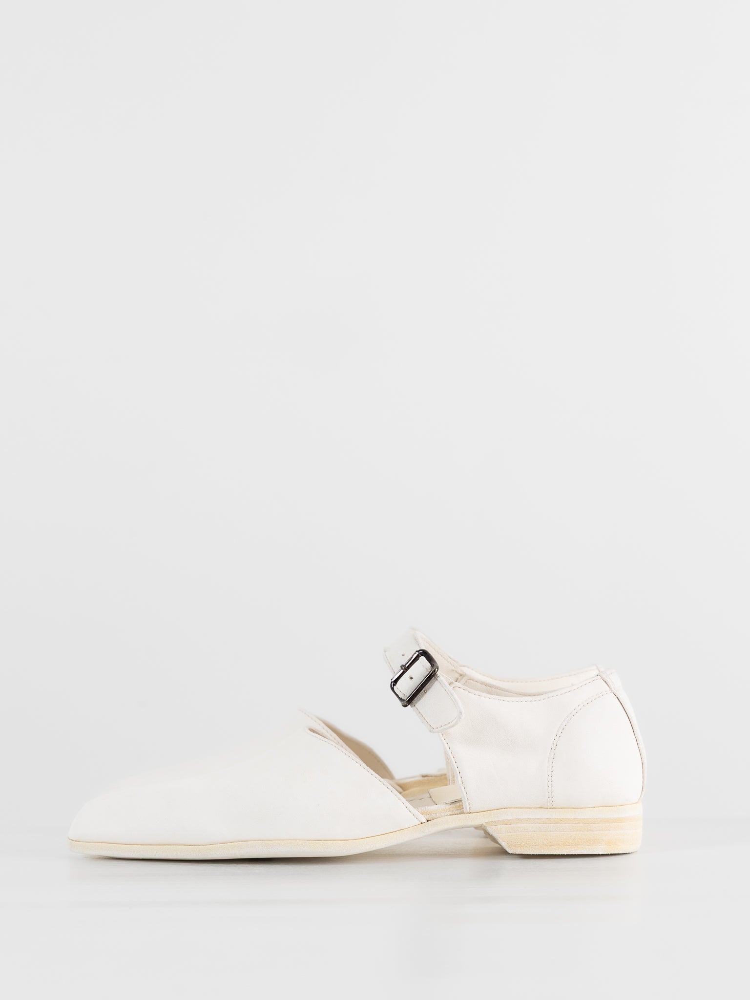 Guidi Mary Jane TX03 in White. A Mary Jane style shoe with an elongated pointy toe and 3/4" stacked leather heel with buckle strap in soft horse full grain leather. Lined.