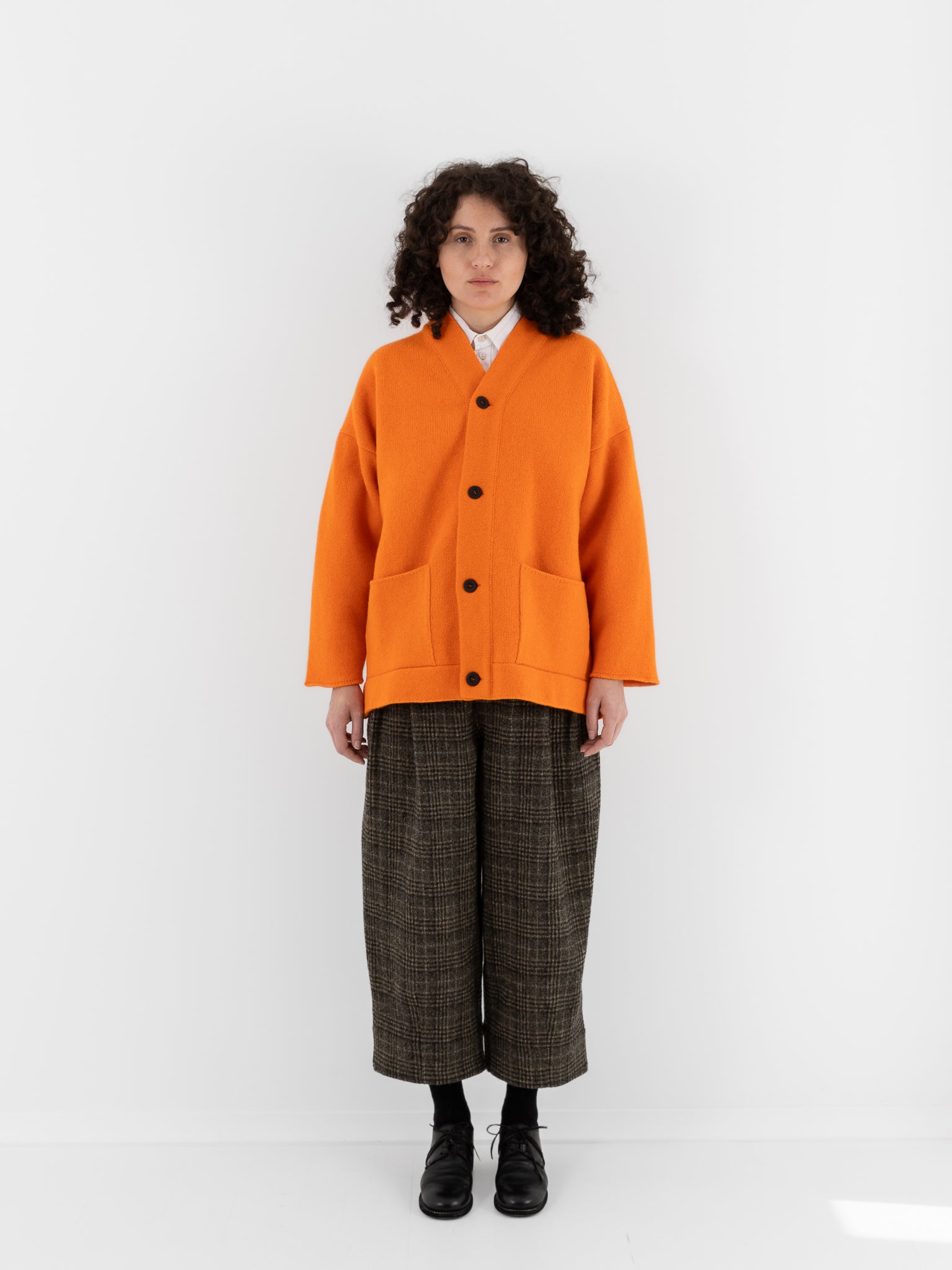 This bold cardigan is knitted in Scotland using Scottish lambswool from a heritage mill. Supremely soft and warm, it has undergone a boiling process to create its densely felted finish. The Librarian Cardigan has a generous and relaxed fit, finished with front pockets and dark corozo buttons.