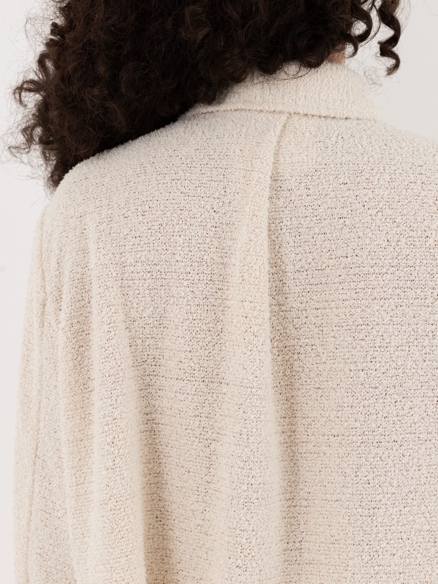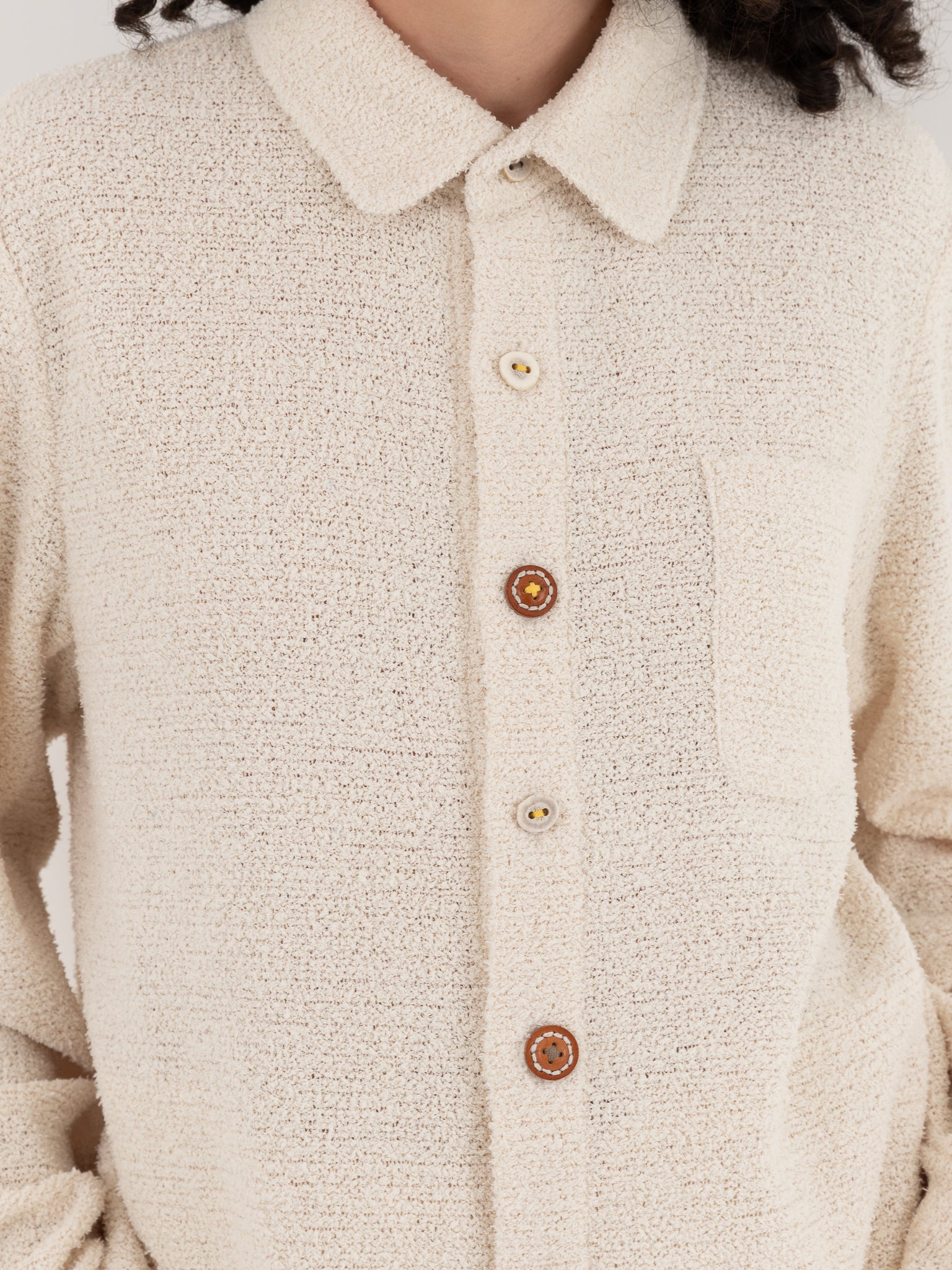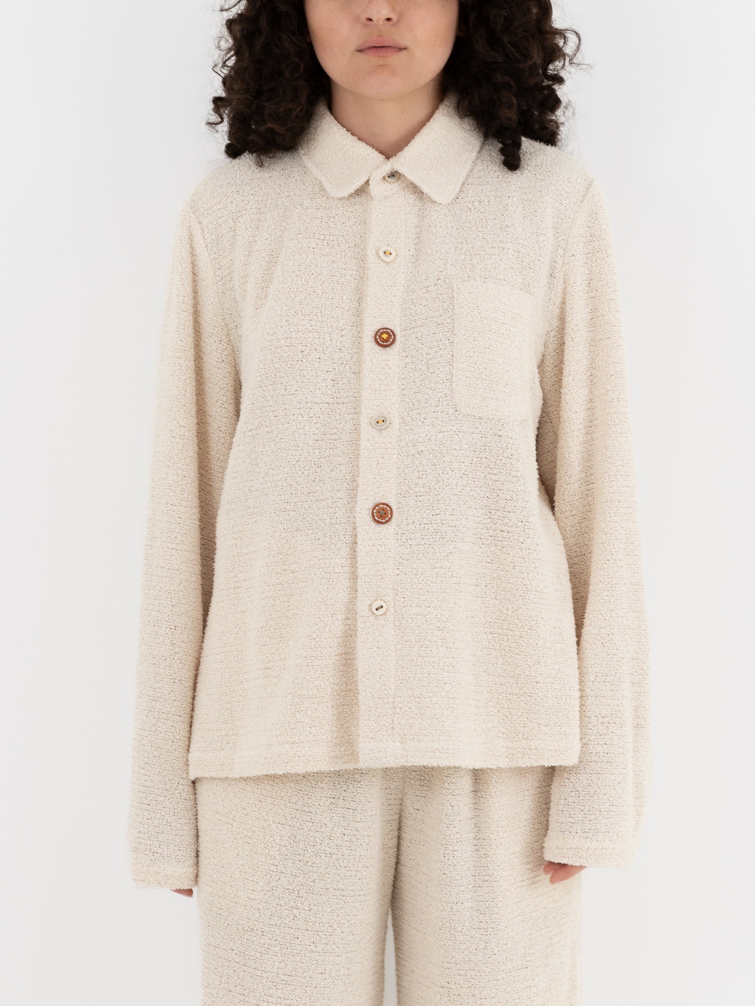 A two piece set in a lightweight and super soft toweling cotton. This is a two-piece ensemble - a relaxed button front collared shirt finished with handmade leather and hand carved horn and bone buttons, and an elastic waist wide leg trouser with side pockets.