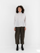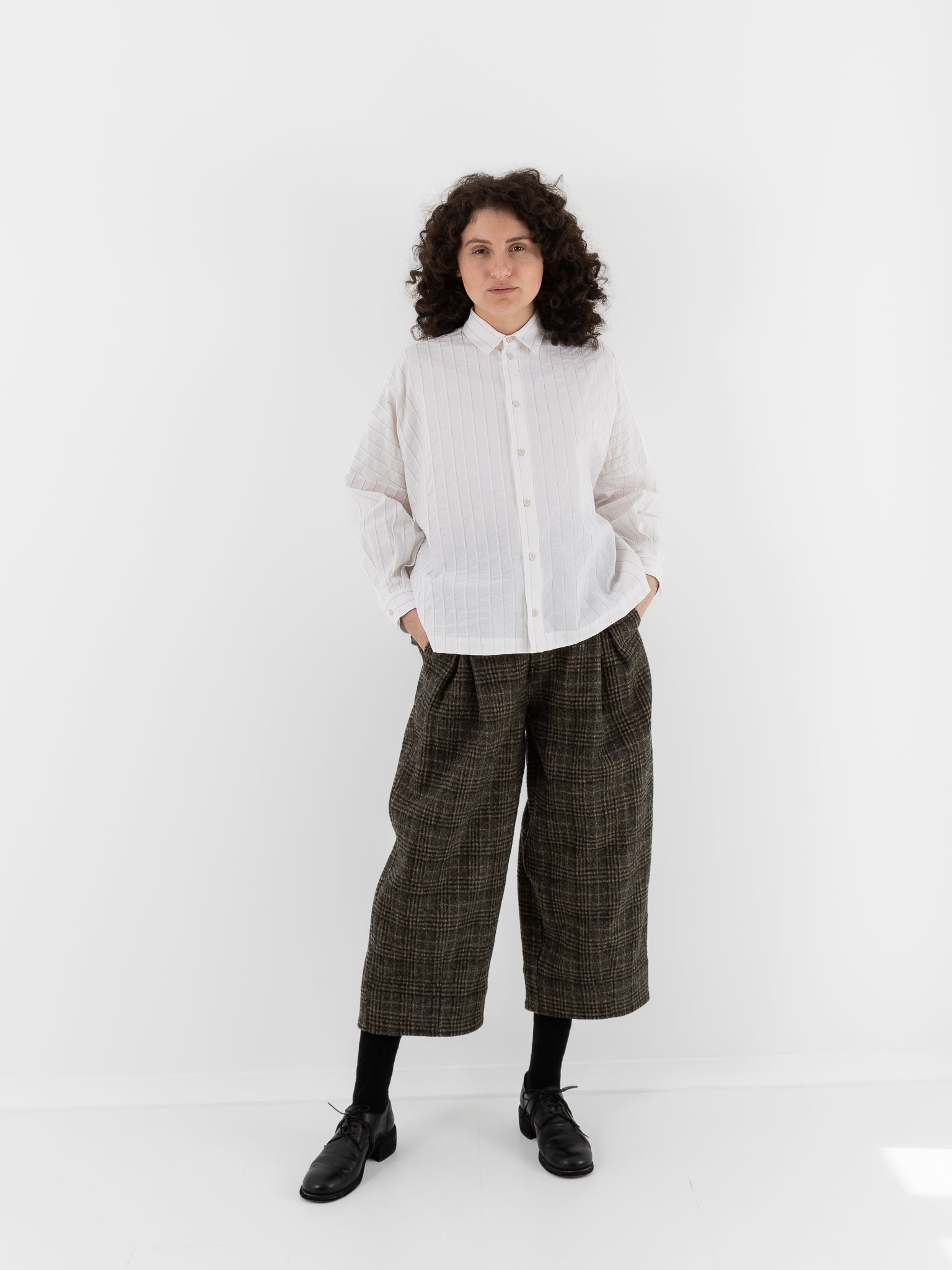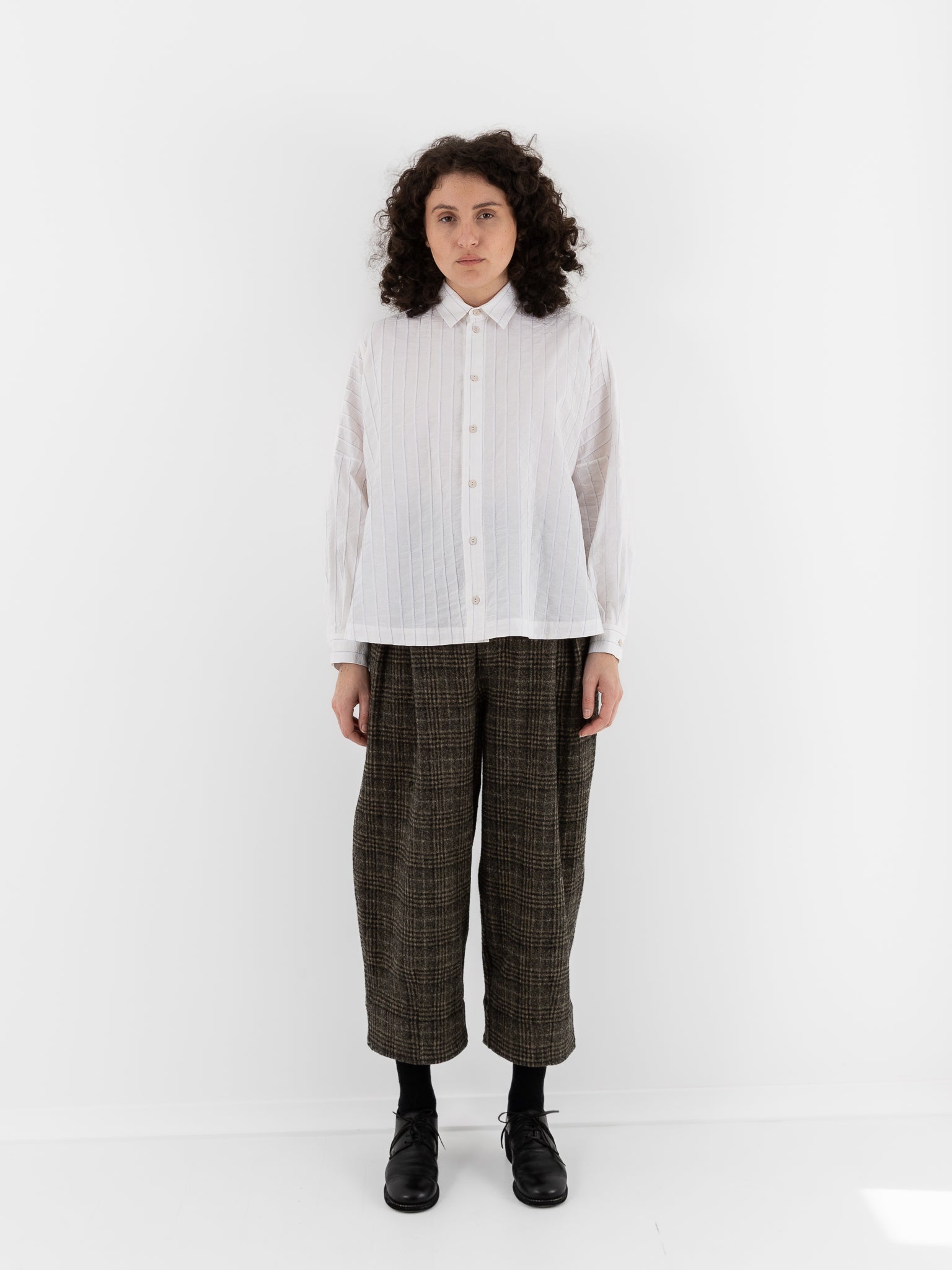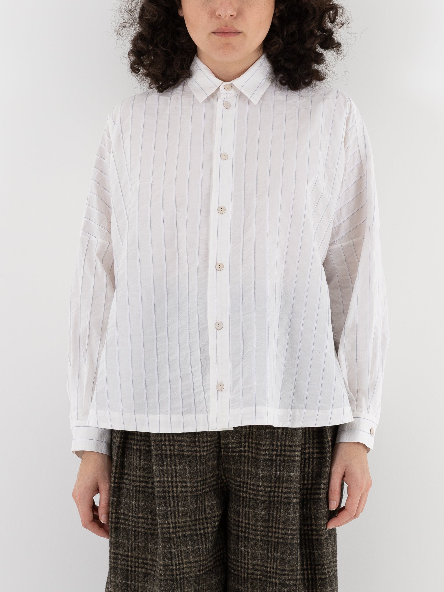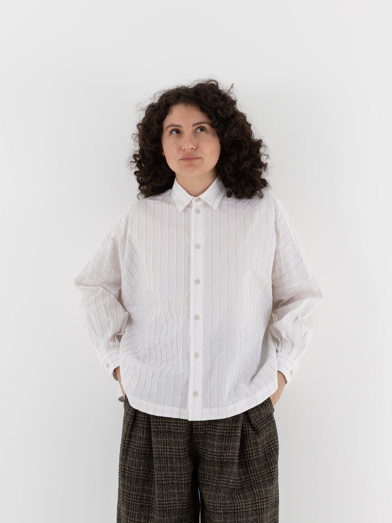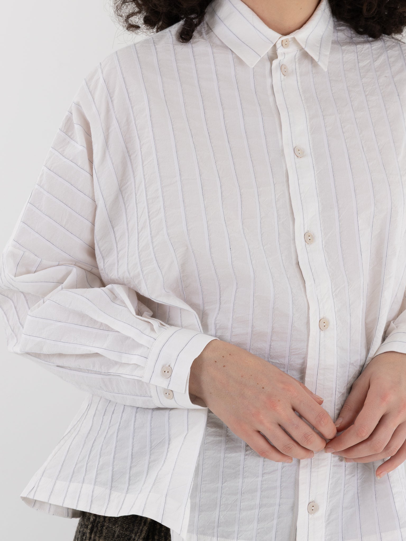 This long sleeve collared shirt is made from a lightweight cotton shirting fabric with subtle raised stripes created by a unique weaving technique. The Farrier is a boxy silhouette with dropped shoulders and sleeves that taper to the buttoned cuffs.