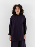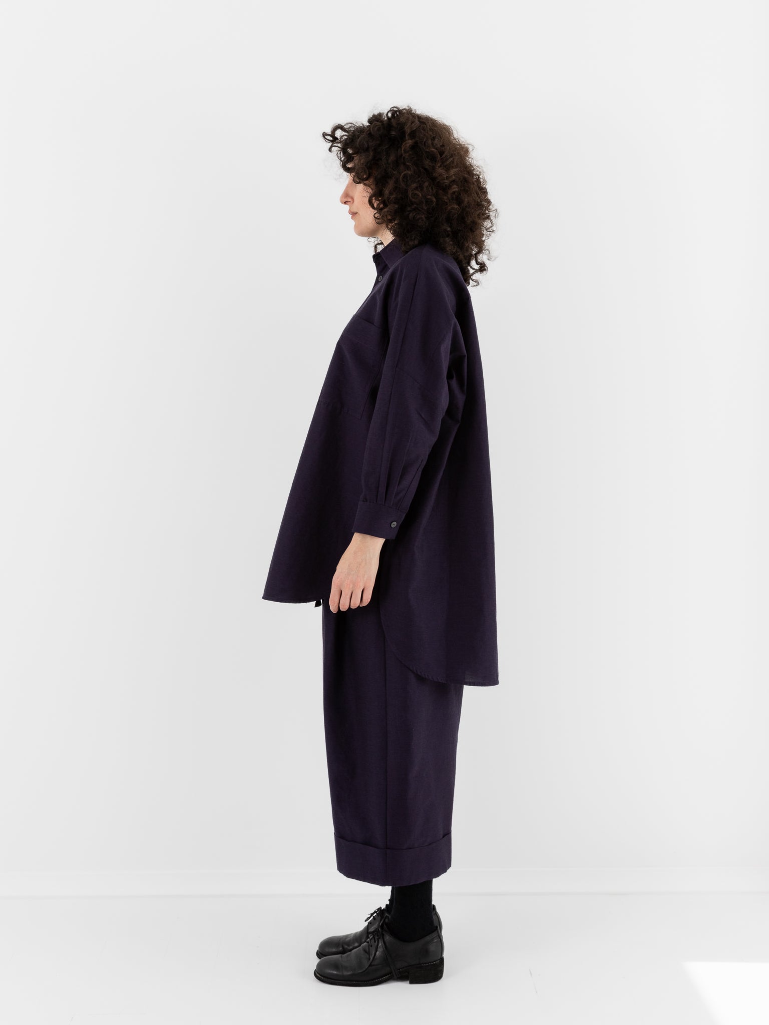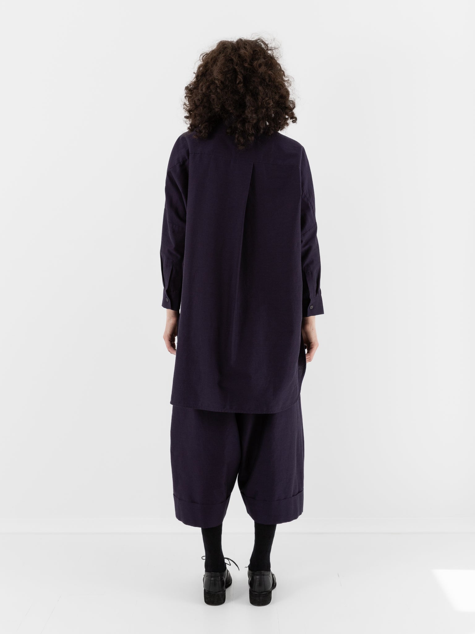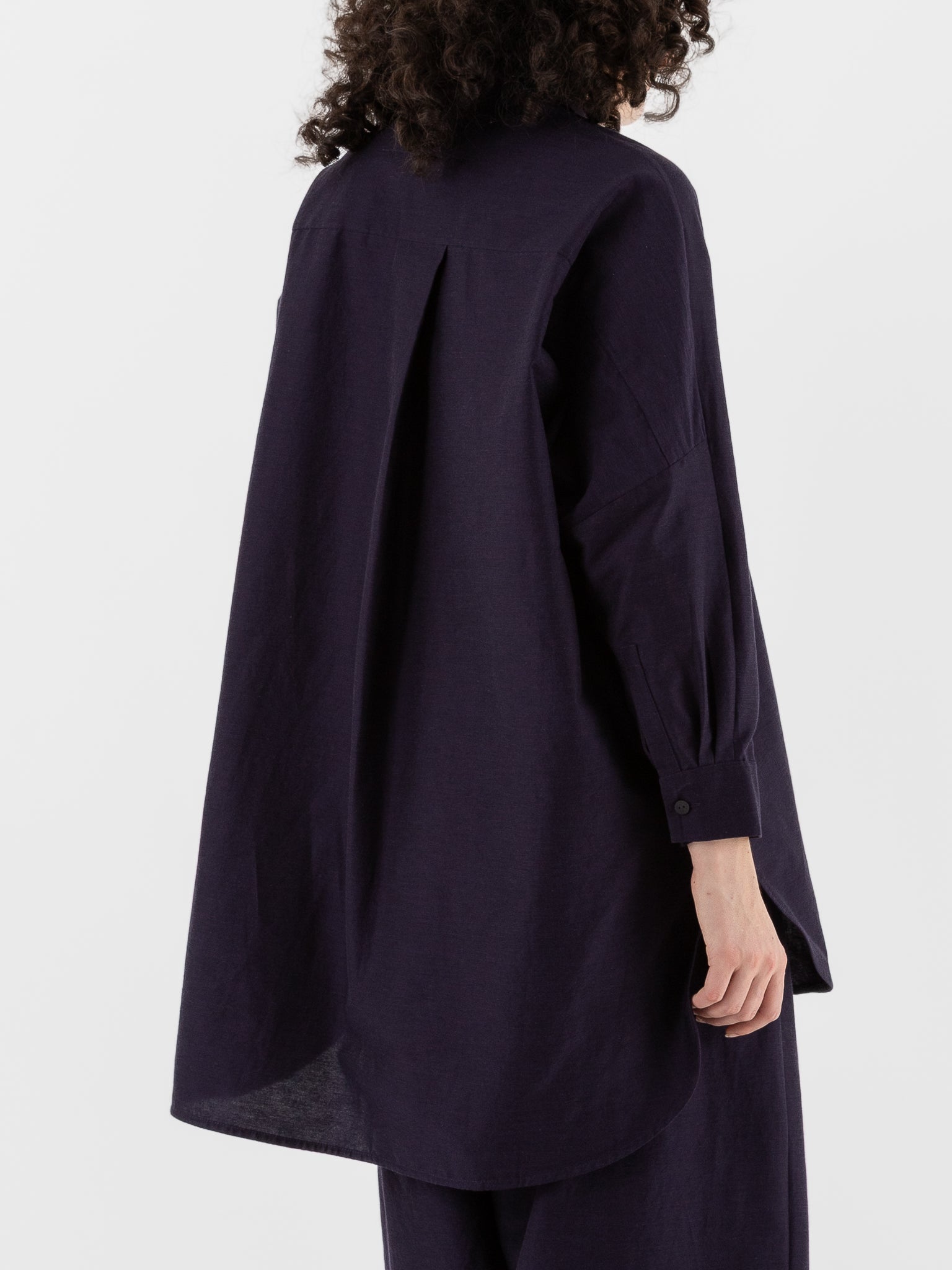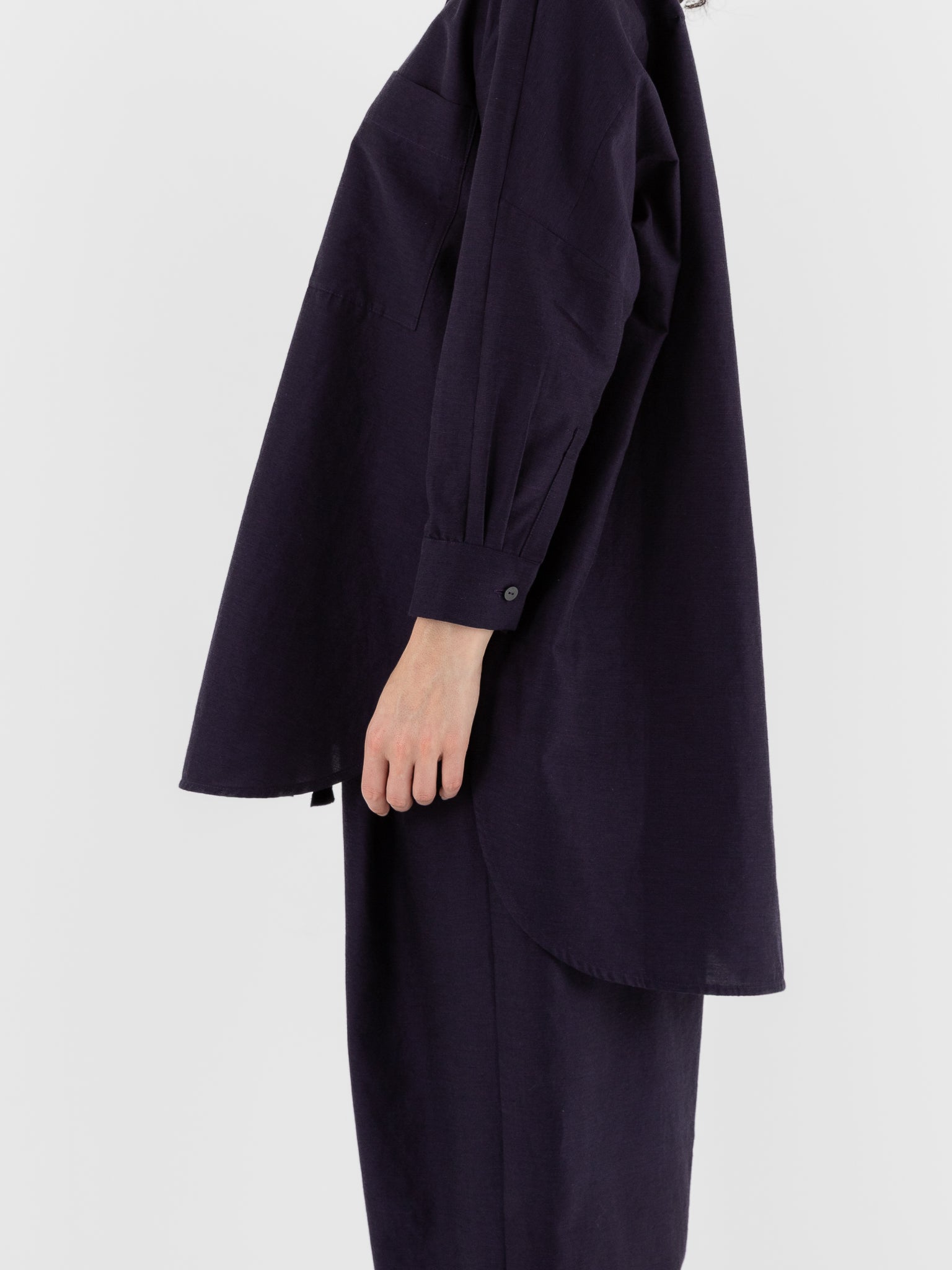 This oversized tunic shirt is made in a luxuriously soft and lightweight blend of cotton and silk with a subtle lustre. The Painter is a relaxed piece, detailed with a sweeping curved hem which steps down front to back. It features a sharp pointed collar, button front, and a large chest patch pocket.