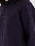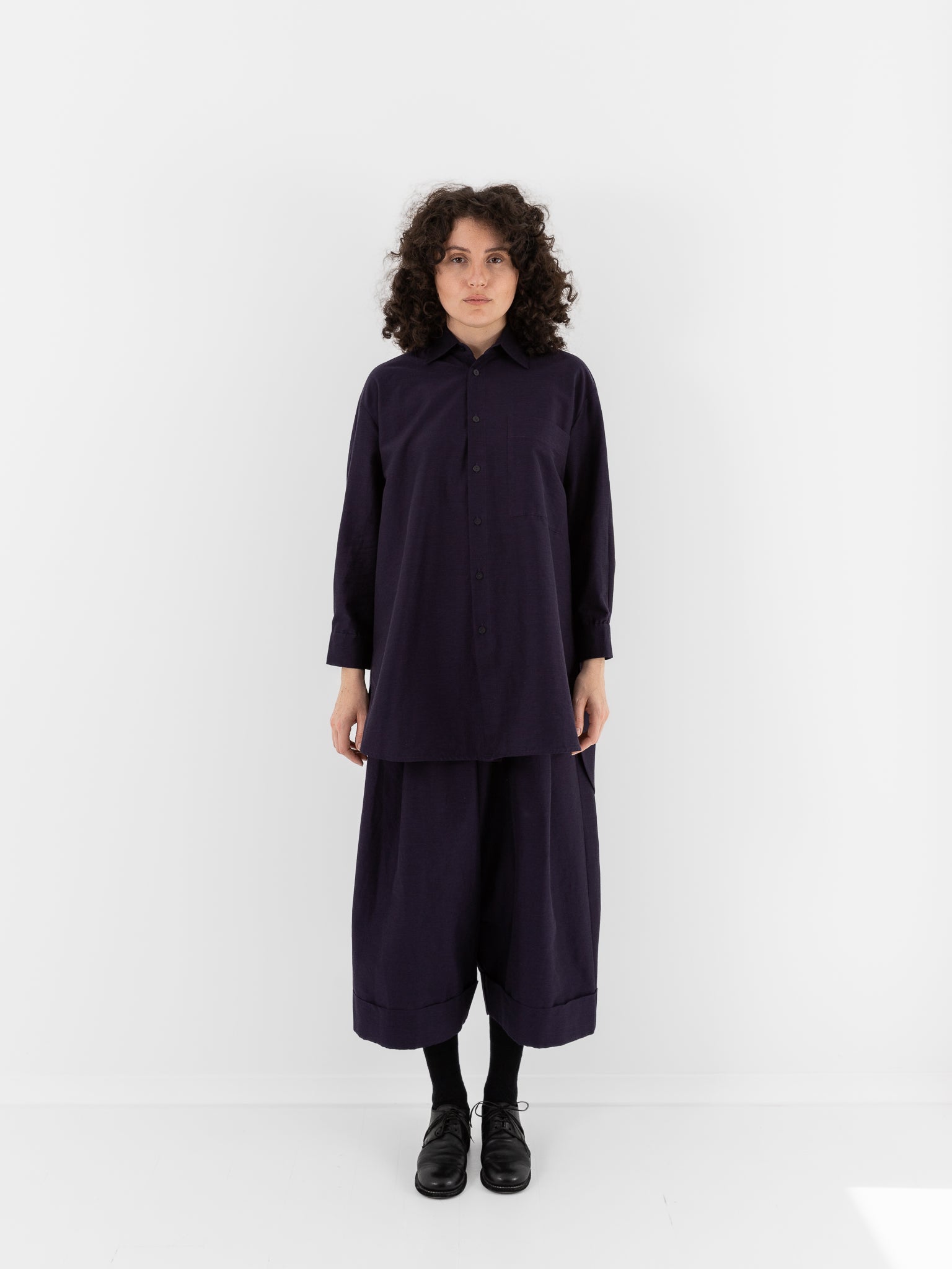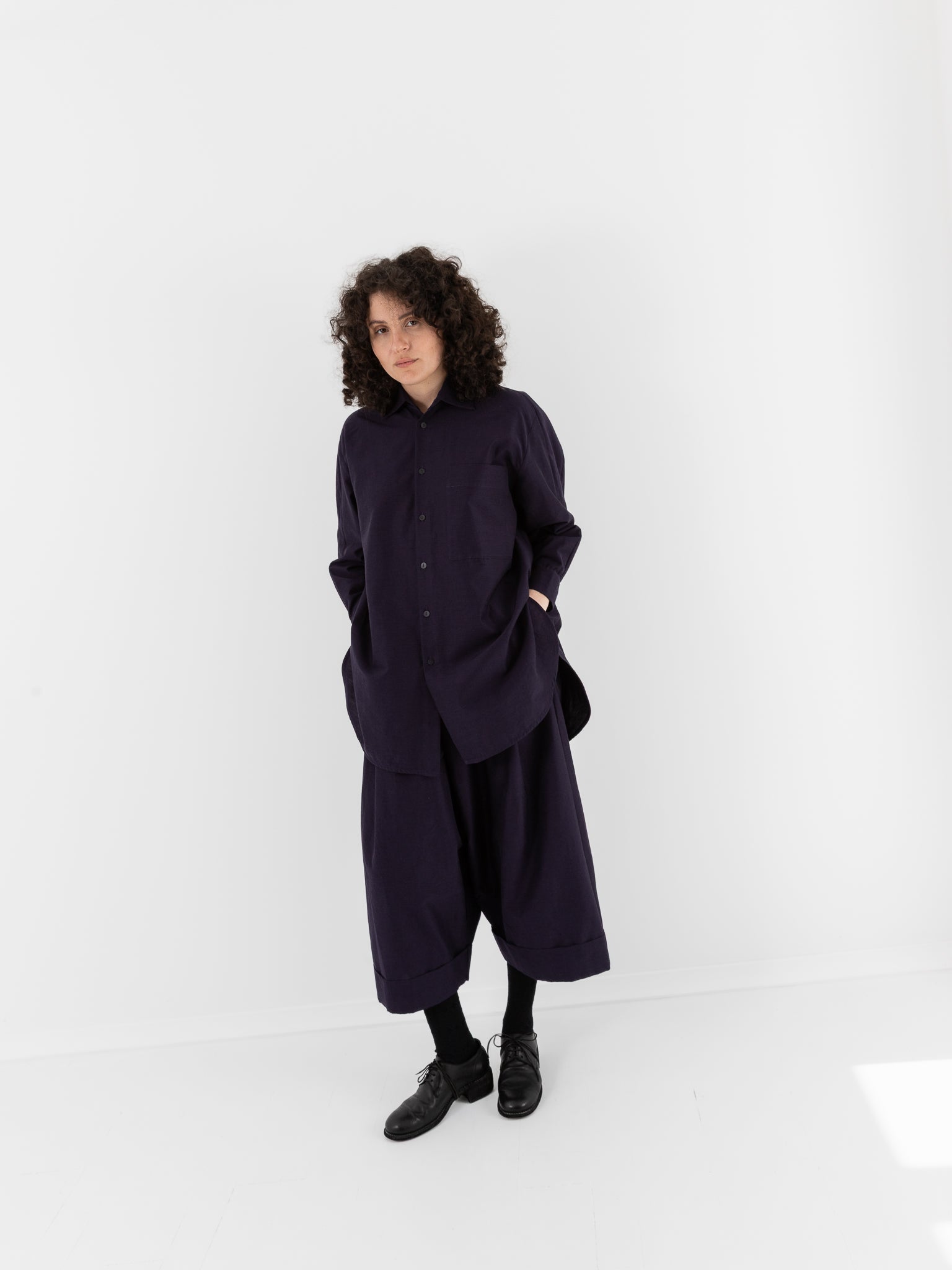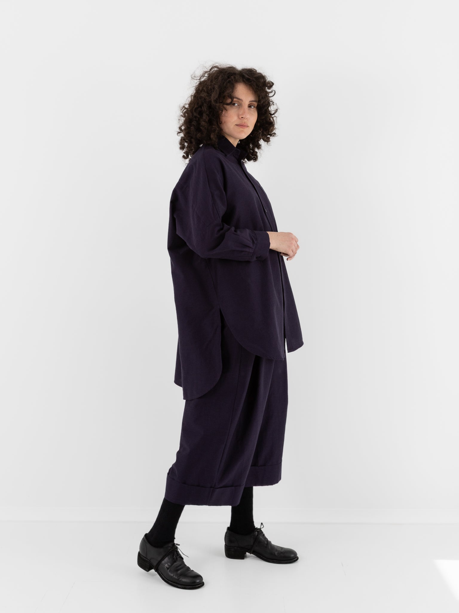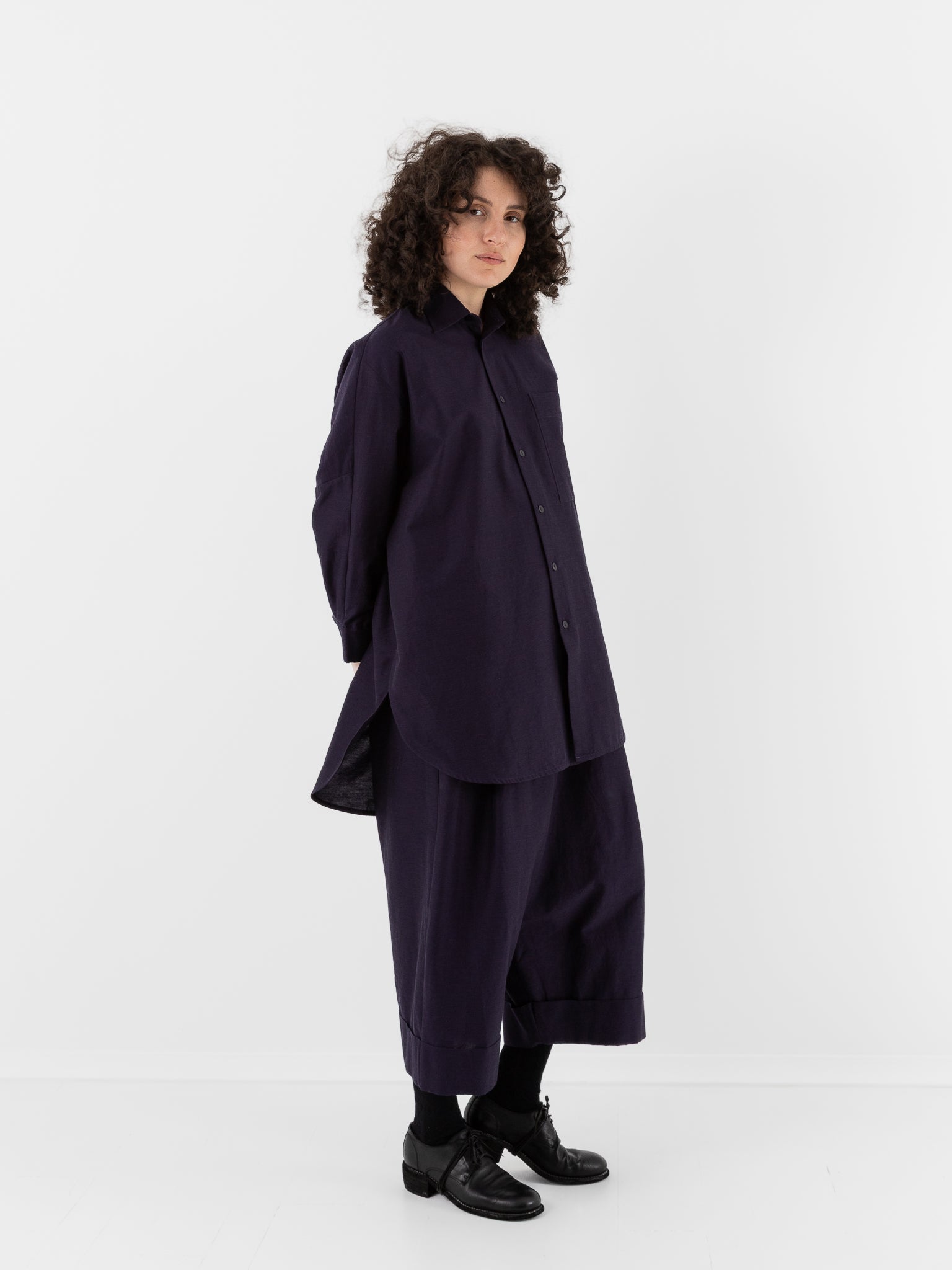 This oversized tunic shirt is made in a luxuriously soft and lightweight blend of cotton and silk with a subtle lustre. The Painter is a relaxed piece, detailed with a sweeping curved hem which steps down front to back. It features a sharp pointed collar, button front, and a large chest patch pocket.