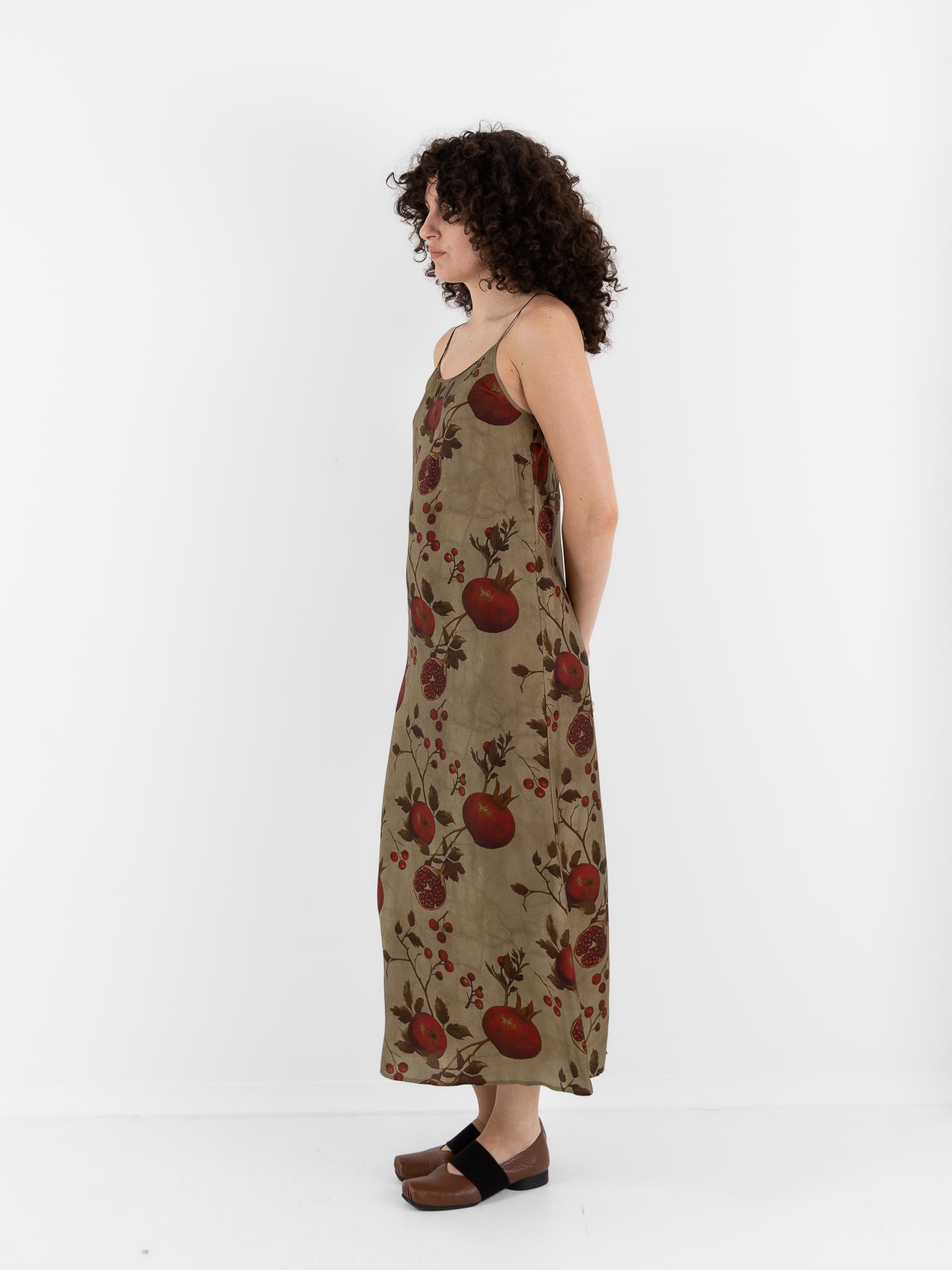 Uma Wang Anaya Dress in Tan/Red/Green. A classic Uma slip dress in viscose/cupro with adjustable straps and a pomegranate motif.