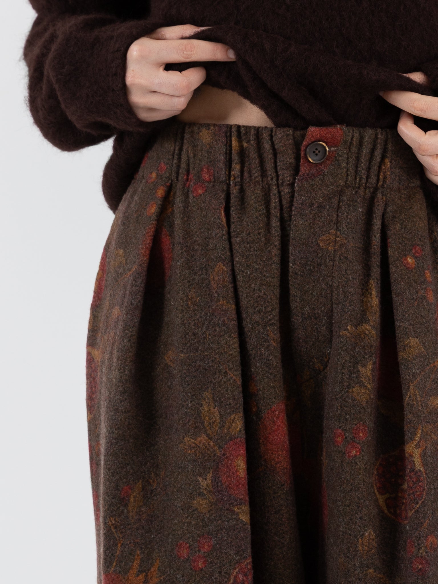 Uma Wang Poetic Pants in Brown/Red. A wide leg trouser in soft virgin wool with a pomegranate motif and flannel-like feel on the interior. This trouser features an elasticated waist with pleating, a concealed button fly, and pockets on the sides as well as two rear welt pockets.